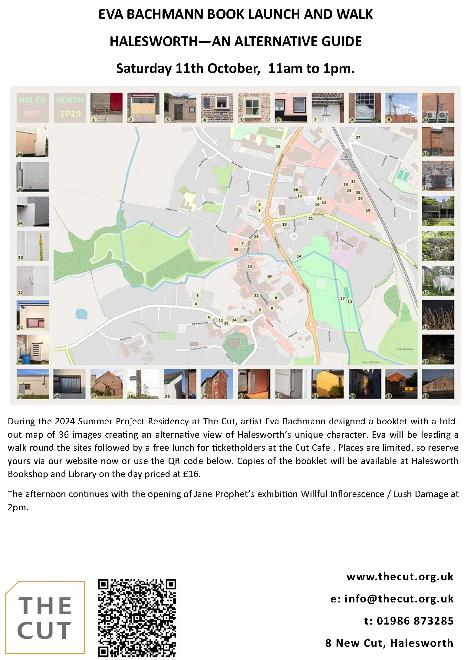 During her 2024 Summer Residency at The Cut, London-based artist Eva Bachmann explored Halesworth through a series of photographs capturing alternative landmarks that reveal the town’s unique character. She created a booklet of 36 images, presented with a fold-out map as a sleeve.